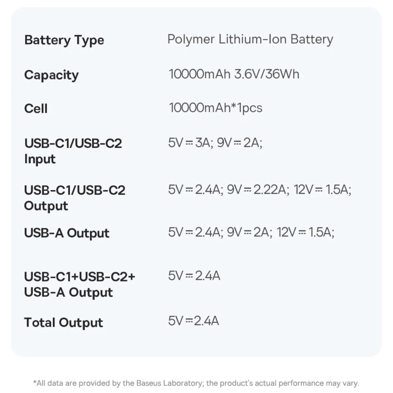 | توان خروجی | USB-C1/C2: 5V/2.4A, 9V/2.22A, 12V/1.5A USB-A: 5V/2.4A, 9V/2.22A, 12V/1.5A |