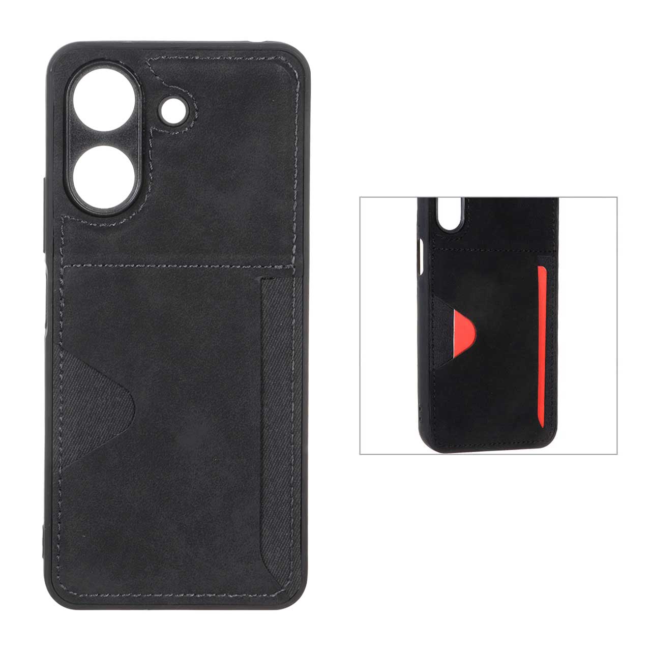 این قاب گوشی از چرم مصنوعی ساخته شده و دور آن از TPU نرم که به خوبی از گوشی شما در هنگام ضربه محافظت می کند. همچنین دارای محافظ لنز دوربین است. این قاب خوش دست و باریک است و به راحتی کارت بانکی درون آن قرار می گیرد.