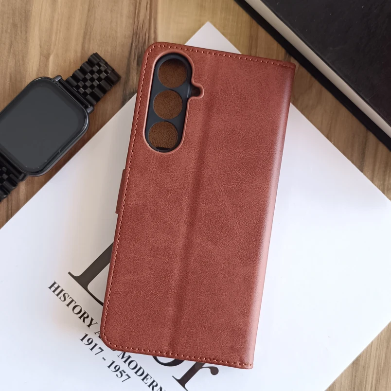 کیف چرمی موبایل مگنتی محافظ لنز دار  Samsung Galaxy S24 FE - قهوه ای