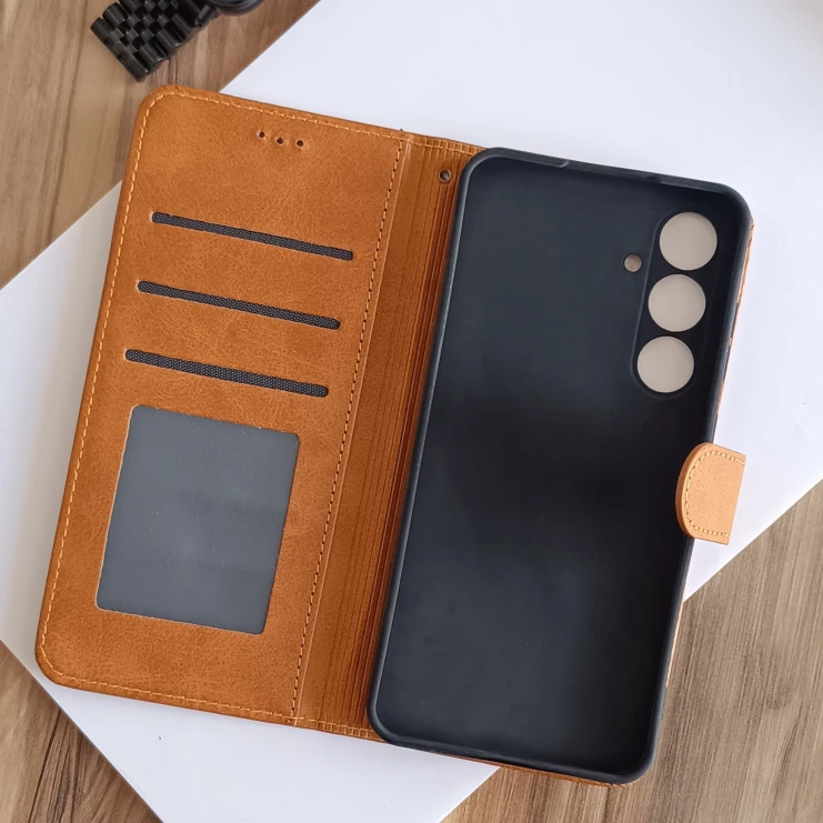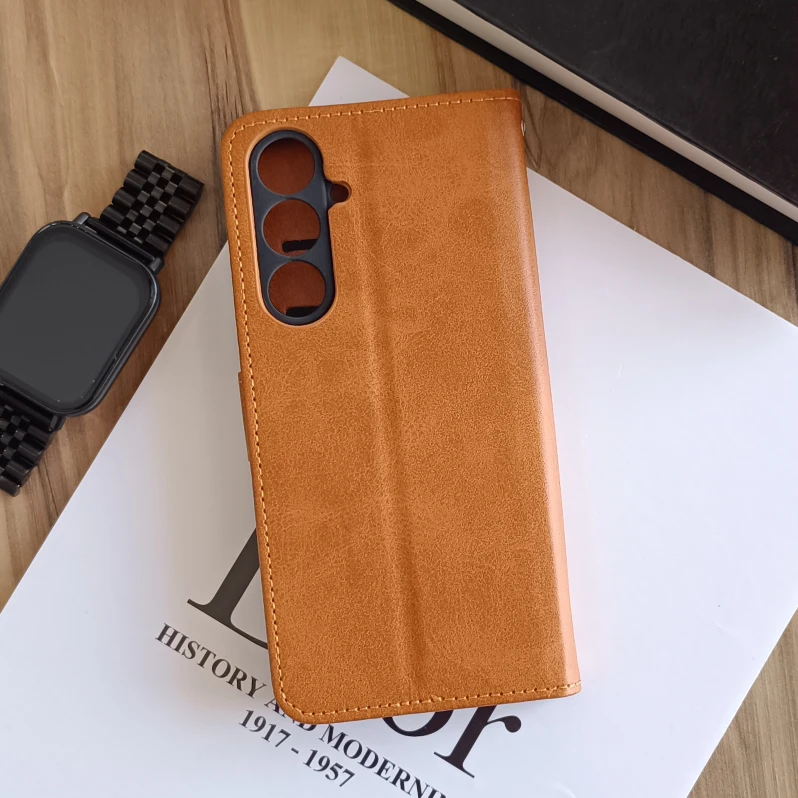 کیف چرمی موبایل مگنتی محافظ لنز دار Samsung Galaxy S24 FE - عسلی