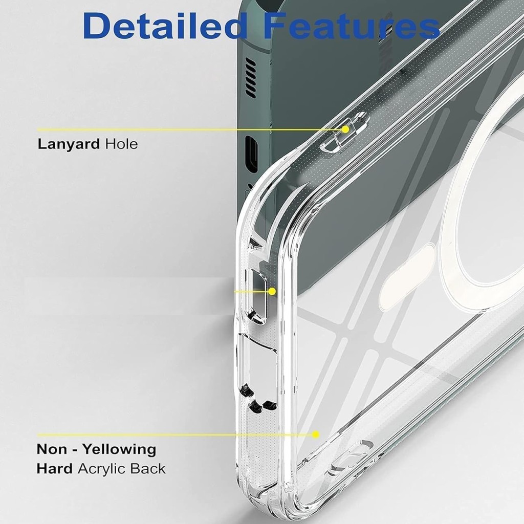 این قاب اورجینال لبه های انعطاف پذیر و پشت سخت دارد و از پلی کربنات TPU شفاف و باکیفیت بالا ساخته شده است. این قاب دارای حلقه مغناطیسی مگسیف است. و قابلیت اتصال Wallet و شارژر بی سیم را دارد.