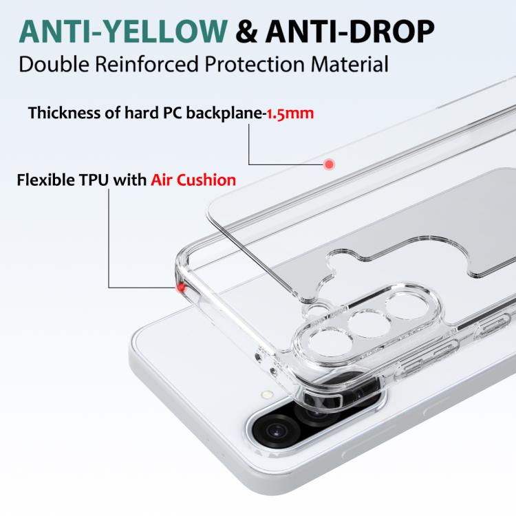 قاب گوشی شفاف A17 دارای لبههای برجسته در اطراف صفحه نمایش و دوربین است که از ضربه و خراشیدگی جلوگیری میکند.همچنین در برابر شوک و سقوطهای ناگهانی مقاومت بسیار خوبی دارد.