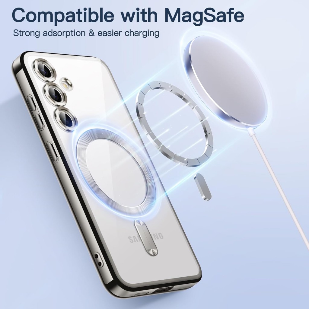 قاب گوشی الکتروپلیتد سامسونگ S24 FE از شارژ سریع بی سیم پشتیبانی می کند. این ویژگی امکان اتصال محکم و آسان لوازم جانبی مانند شارژر بی سیم، کیف های مغناطیسی و پاینده نگهدارنده را فراهم میکنم. بدون نیاز به جدا کردن قاب گوشی می توانید گوشی را به سرعت شارژ کنید.